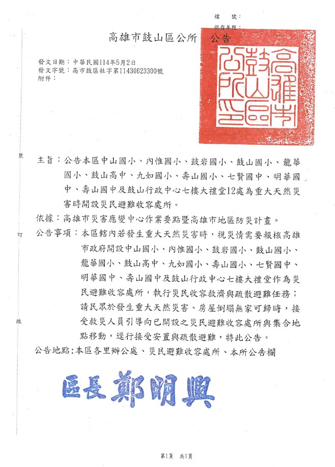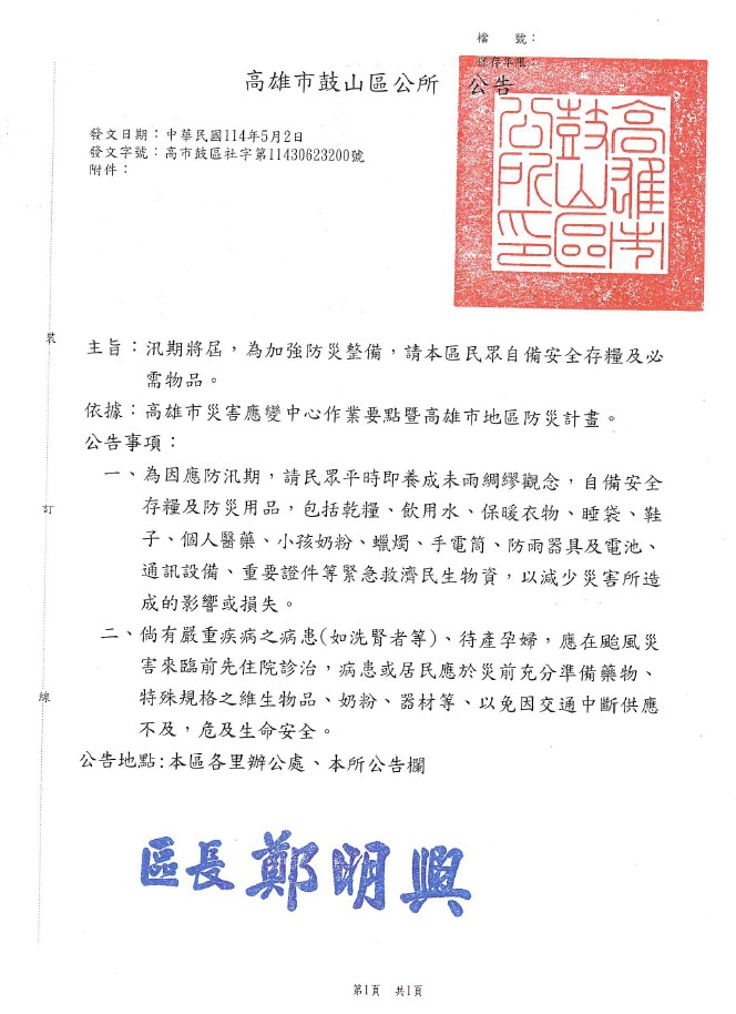 鼓山區因應各項災害災民收容救濟民生物資開口契約協定一覽表