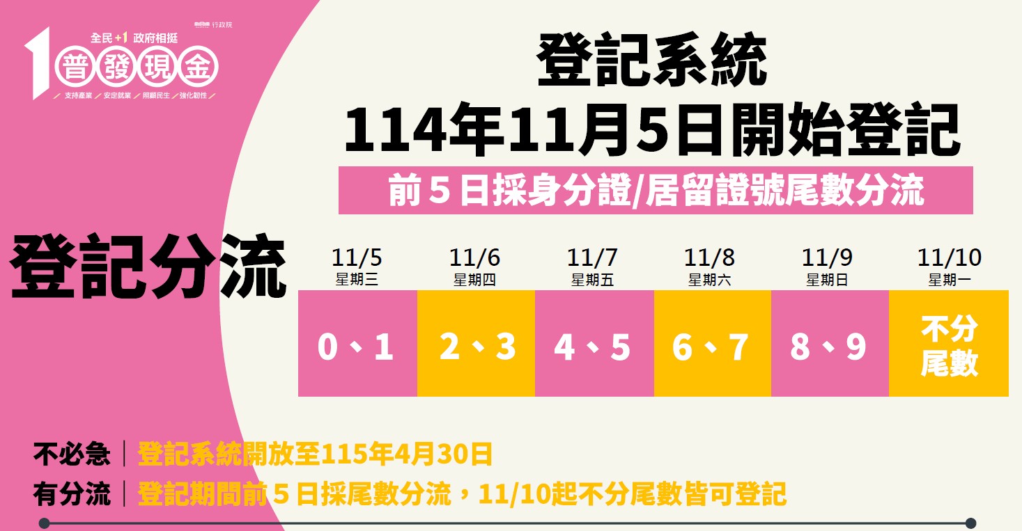 🔔普發現金登記網站於11月5日起至11月9日為期5天開放預登記,並於11月10日起全面開放登記🔔